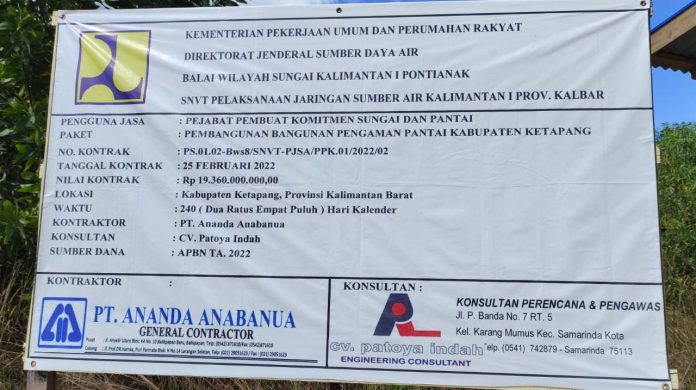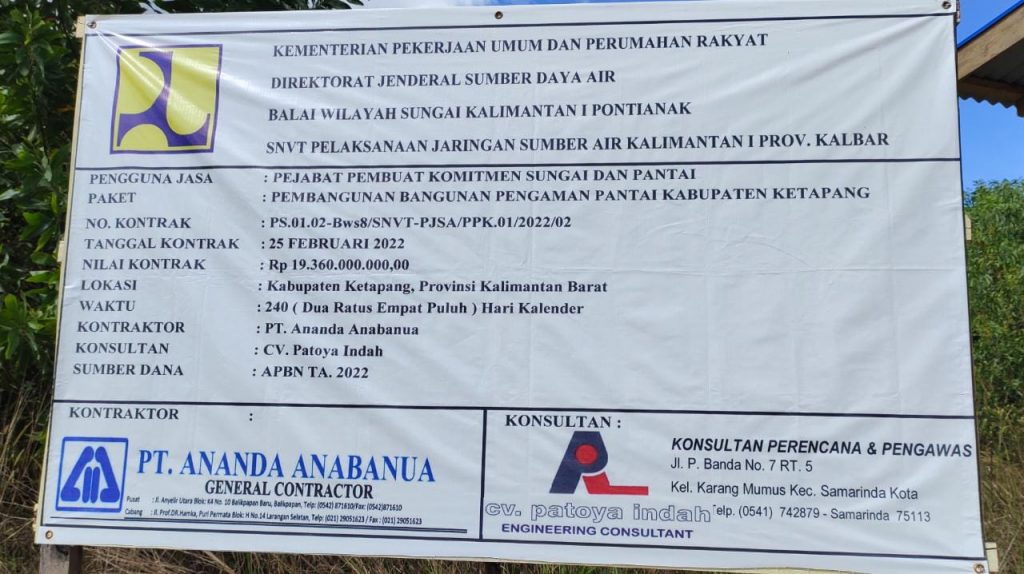 Bentuk jenis tipe Proyek perampok uang Negara yang disinyalir indikator proyek pembangunan milik Kemernterian Pekerjaan Umum dan Perumahan Rakyat Direktorat Jenderal Sumber Daya Air, Balai wilayah Sungai Kalimantan I Pontianak, SNVT Pelaksanaan Jaringan Sumber Air Kalimantan I Prov. Kalbar dengan Nomor Kontrak : PS.01.02-Bws8/SNVT-PJSA/PPK-01/2022/02. Nama Paket Proyek Pembangunan Bangunan Pengaman Pantai Kabupaten Ketapang Kalimantan Barat (Kalbar) Pelaksana Kerja proyek PT.ANANDA ANABANUA bersama Sumber aliran Dana APBN (Anggarana Pendapatan Belanja Negara) T.A 2022.