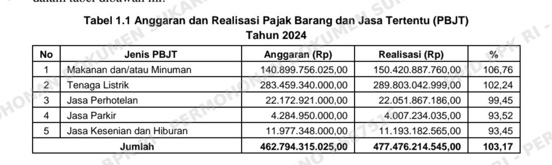 Pelaporan DPP dan Penetapan PBJT Belum Dilaksanakan Secara Tertib dan Perhitungan Denda Belum Sesuai Ketentuan Pemerintah Kabupaten Karawang menganggarkan penerimaan Pajak Barang dan Jasa Tertentu (PBJT) pada APBD TA 2024 sebesar Rp462.794.315.025,00, dengan realisasi sebesar Rp477.476.214.545,00 atau sebesar 103,17% dengan uraian digambarkan dalam tabel dibawah ini.