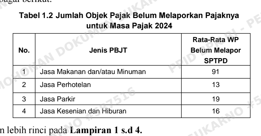Berdasarkan data SPTPD per 31 Desember 2024 diketahui bahwa terdapat WP yang belum menyampaikan laporan pajak untuk masa pajak Januari s.d. Desember 2024 adalah sebagai berikut.Penjelasan lebih rinci pada Lampiran 1 s.d 4.