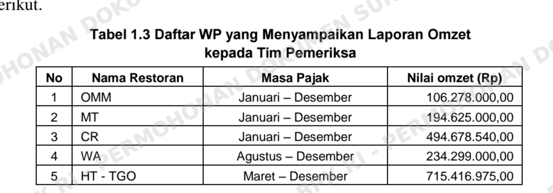 Terdapat tujuh WP dengan nilai omzet sebesar Rp2.443.745.013,00 belum melaksanakan kewajiban pelaporan dan pembayaran pajak Hasil konfirmasi secara uji petik kepada WP PBJT pada tanggal 23 s.d. 26 April 2025,laporan omzet dari WP yang belum melaporkan menyampaikan SPTPD diketahui terdapat tujuh WP dengan nilai omzet sebesar Rp2.443.745.013,00 belum melaksanakan kewajiban pelaporan dan pembayaran pajak, dengan uraian sebagai berikut.