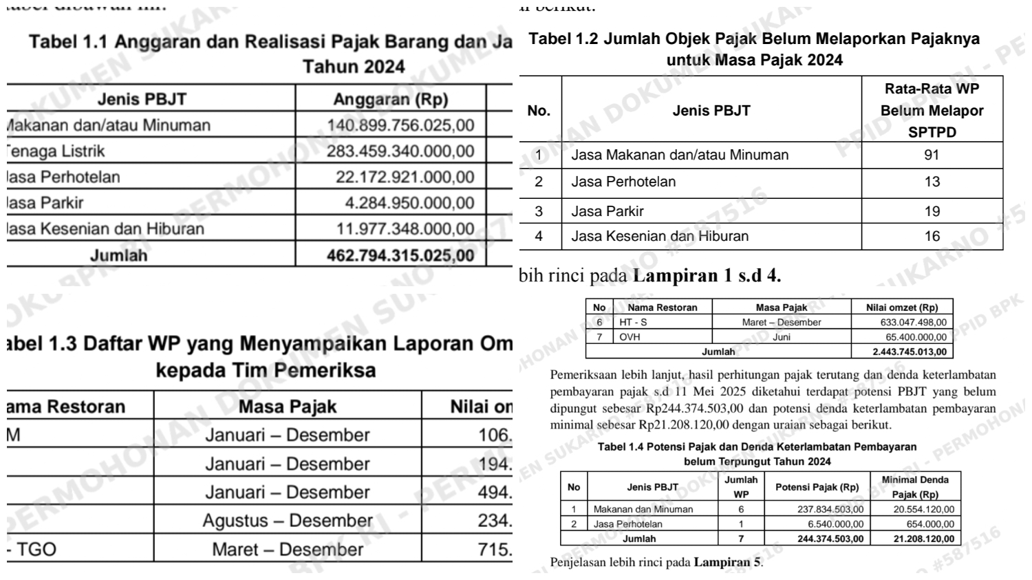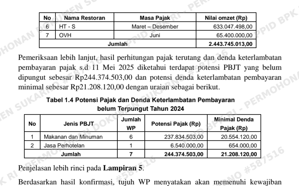 Pemeriksaan lebih lanjut, hasil perhitungan pajak terutang dan denda keterlambatan pembayaran pajak s.d 11 Mei 2025 diketahui terdapat potensi PBJT yang belum dipungut sebesar Rp244.374.503,00 dan potensi denda keterlambatan pembayaran minimal sebesar Rp21.208.120,00 dengan uraian sebagai berikut.