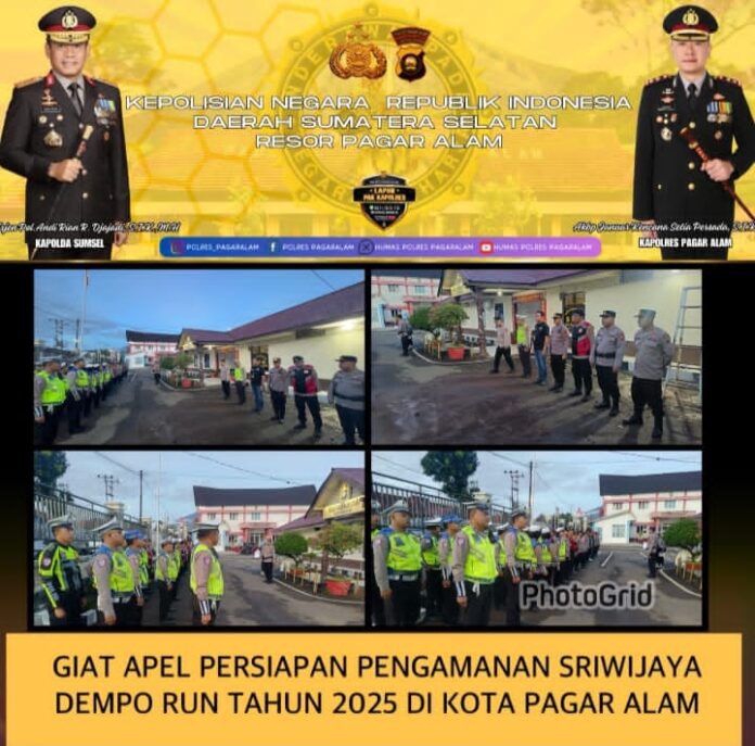 Pagar Alam,- Rajawalinews,- Polres Pagar Alam dalam mendukung kegiatan Sriwijaya Dempo Run Tahun 2025 melaksanakan Pam yang dilaksanakan pada hari Sabtu 06 Desember 2025 sekira pukul 05.30 WIB s/d selesai dengan mengerahkan 121 personel yang tersprin yang dipimpin langsung Kapolres Pagar Alam AKBP Januar Kencana Setia Persada,. S.I.K didamping Wakapolres Pagar Alam Kompol Wahyu Prasetyo. S. H, M. Si beserta Kabag Ops Polres Pagar Alam Akp Ramsi, S. H, Padal Pam, Personel Pam diawali dengan Apel kesiapan di Mako Polsek Pagar Alam Utara.
