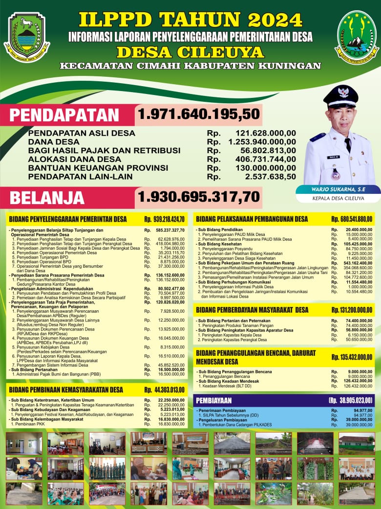 Kuningan, rajawalinews.online – Pemerintahan Desa Cileuya, Kecamatan Cimahi, yang dipimpin oleh Kepala Desa Warjo Sukarna, S.E., terus menunjukkan komitmennya dalam mewujudkan pemerintahan yang transparan dan akuntabel. Dalam laporan anggaran tahun 2024, Kepala Desa Warjo memaparkan penggunaan dana desa yang bertujuan untuk meningkatkan kesejahteraan masyarakat. Berikut gambaran mendalam mengenai penggunaan anggaran yang telah disusun dengan prinsip efisiensi dan keadilan.