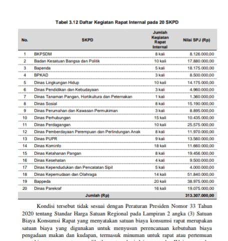 Hasil pemeriksaan atas dokumen pertanggungjawaban belanja makan minum TA 2023 menunjukkan terdapat 20 SKPD yang merealisasikan biaya konsumsi rapat