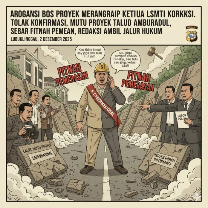 Alih-alih memberikan klarifikasi yang profesional, pemilik proyek berinisial S, yang ironisnya juga menjabat sebagai Pimpinan Redaksi media lain, sekaligus Ketua LSM Anti Korupsi, justru diduga menghalangi tugas pers dan melancarkan serangan balik berupa fitnah keji.