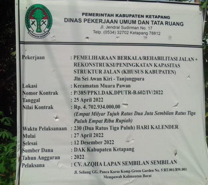 Temuan kegiatan Proyek milik Dinas PUPR Kabupaten Ketapang Kalbar dikerjakan pemenang Lelang atas nama CV. AZQHA LAPAN SEMBILAN SEMBILAN dengan pagu anggaran sebesar Rp.4.702.934.000.00. Proyek pemeliharaan berkala/rehabilitasi jalan+rekontruksi/peningkatan kapasitas struktur Jln Sei. Awan Kiri – Tanjungpura. Yang perlu dipertanyakan pada kegiatan Proyek tersebut adalah, apa sudah benar dan kenapa pekerjaan penghamparan rabat beton tersebut tidak mempunyai alas dasar sejenis tikar plastic, adapun cuma hanya menutup mal di sisi penghamparan material saja, sedangkan ketebalan pun cuma 15 Cm.’’ungkapnya Jumadi.