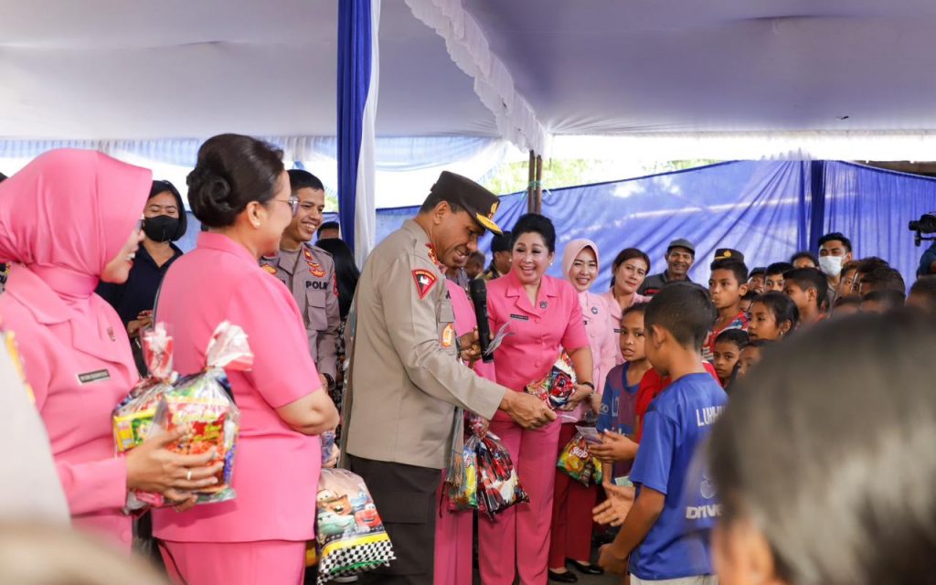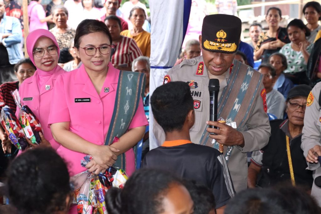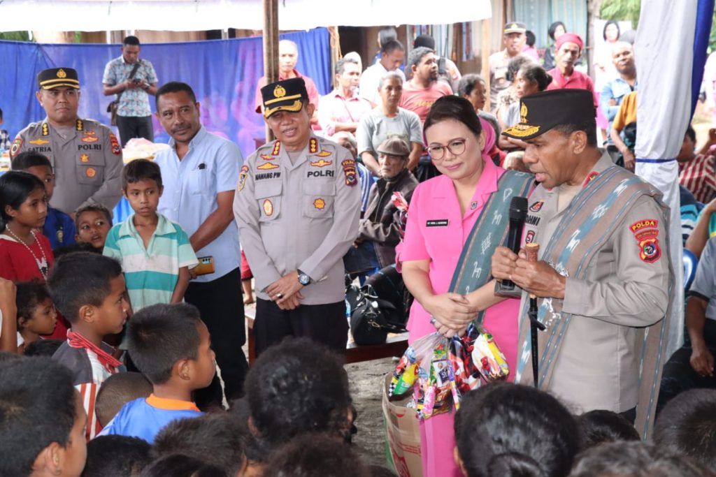 Kapolda NTT dan Ketua Bhayangkari Daerah NTT juga membagikan Bingkisin kepada anak-anak dikampung Bena, sekaligus memberikan motivasi kepada anak-anak lebih giat belajar.