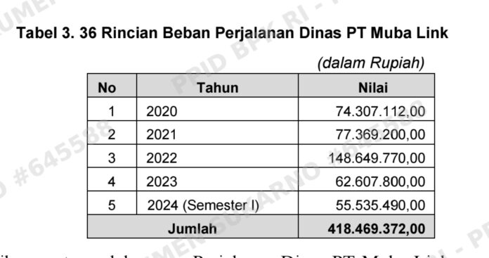 Penatausahaan Perjalanan Dinas PT Muba Link Tidak Memadai Dalam mendukung pelaksanaan kegiatan operasionalnya, untuk periode Tahun 2020 s.d. 2024 (Semester I) PT Muba Link merealisasikan Beban Perjalanan Dinas sebesar Rp418.469.372,00 dengan rincian sebagai berikut.