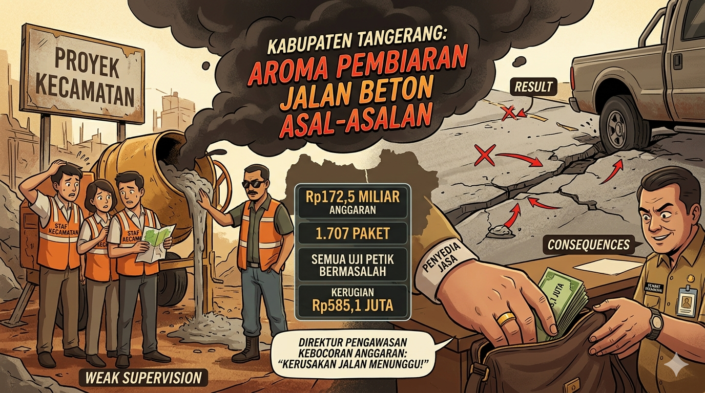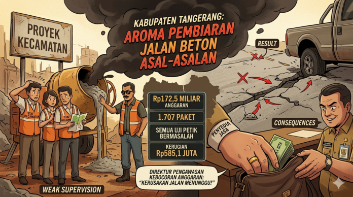 Kabupaten Tangerang — Aroma dugaan pembiaran dalam proyek pembangunan jalan beton di tingkat kecamatan kian menyengat. Hasil pemeriksaan terbaru mengungkap fakta mencengangkan: pengawasan pelaksanaan pekerjaan konstruksi jalan di sejumlah kecamatan berlangsung asal-asalan, tanpa dukungan tenaga ahli, fasilitas memadai, maupun kontrol teknis yang ketat.