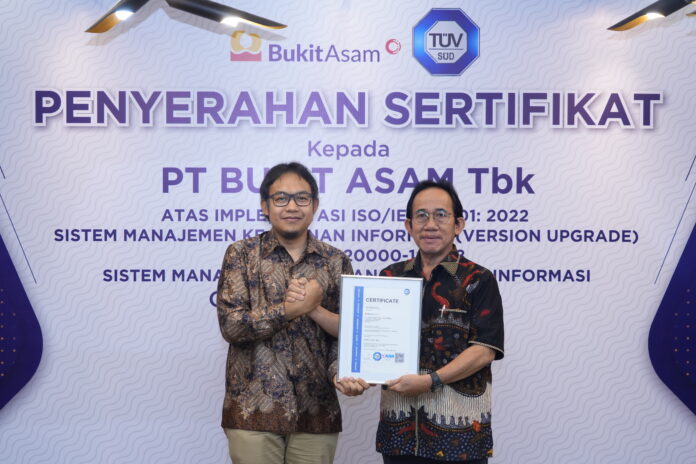Sumsel, Rajawali News, PT Bukit Asam Tbk (PTBA) menerima sertifikat ISO 20000-1:2018 terkait Standar Manajemen Layanan Teknologi Informasi dari badan sertifikasi PT TUV SUD Indonesia. Sertifikasi ini menjadi tonggak penting dalam upaya perusahaan memberikan layanan teknologi informasi terbaik.