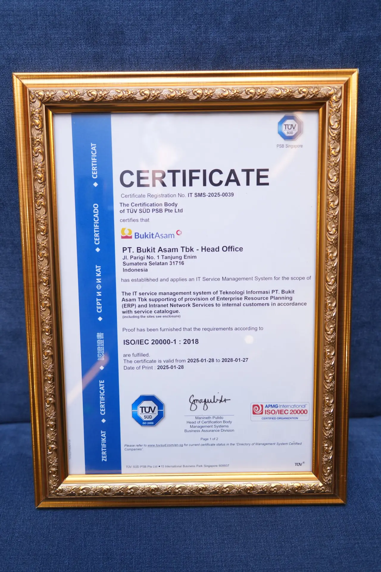 Bukit Asam (PTBA) Raih Sertifikat Berstandar Internasional untuk Layanan Teknologi Informasi