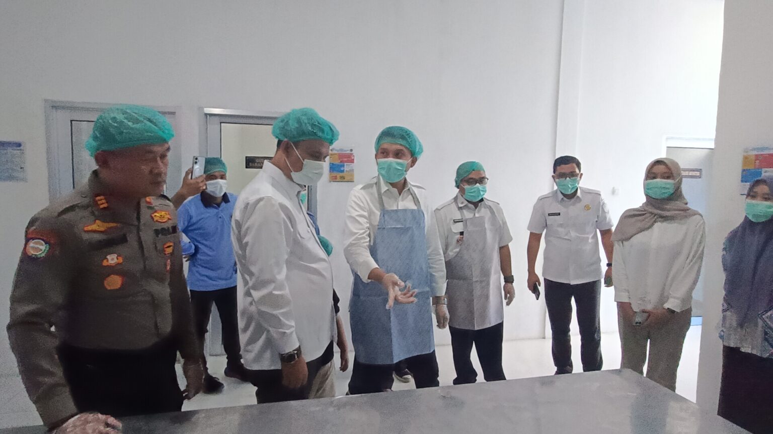 Menggunakan pakaian steril, Panca didampingi owner Aswan Mufti juga meninjau sejumlah ruangan yang ada. Mulai dari ruangan memasak, ruangan penyimpanan sayuran dan daging, ruangan pencucian ompreng dan melihat menu yang dimasak hari itu.