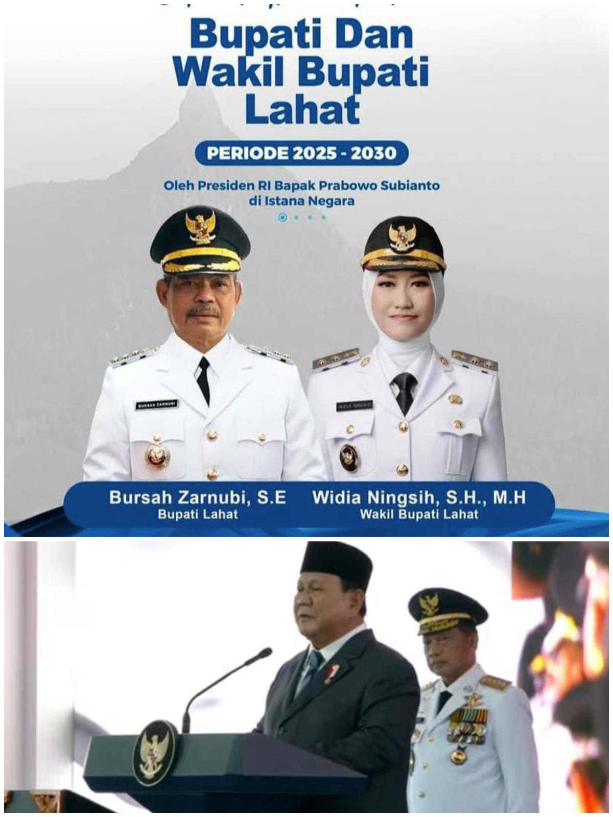 Bursah Zarnubi dan Widia Ningsih dilantik Bupati dan Wakil Bupati Kabupaten Lahat periode 2025-2030 oleh Presiden Republik Indonesia Prabowo Subianto diIstana Negara Jakarta. Bursah dan Widia meraih suara terbanyak dengan 103.950 suara pasangan nomor urut 01 dalam pilkada Lahat 2024 lalu.