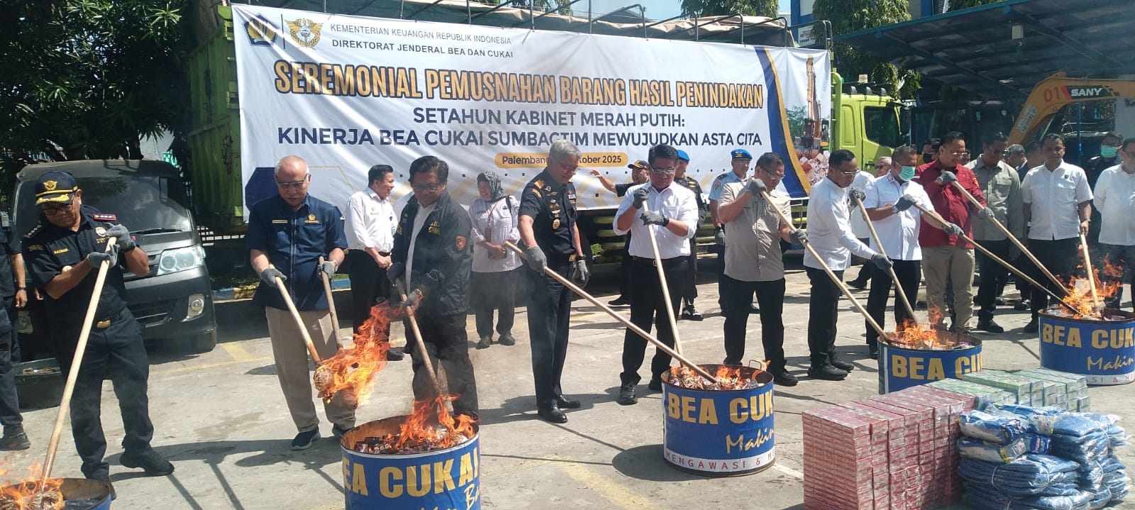 Sebagai bentuk transparansi dan akuntabilitas publik, Bea Cukai Sumbagtim juga melaksanakan pemusnahan Barang Milik Negara (BMN) hasil penindakan di wilayah kerjanya.Total nilai barang yang dimusnahkan mencapai miliaran rupiah, terdiri atas rokok ilegal, minuman keras, pakaian bekas, serta berbagai barang larangan dan pembatasan lainnya.