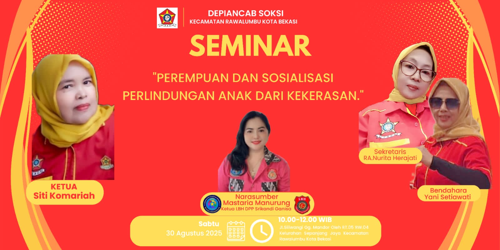 Lembaga Bantuan Hukum (LBH) DPP Srikandi Ganisa yang diketuai oleh Mastaria Manurung akan menggelar seminar bertajuk “Perempuan dan Sosialisasi Perlindungan Anak dan Kekerasan” pada 30 Agustus 2025 mendatang.