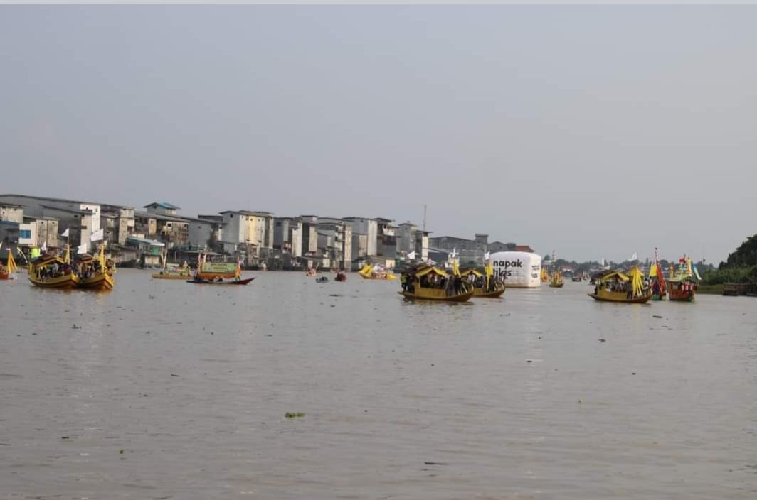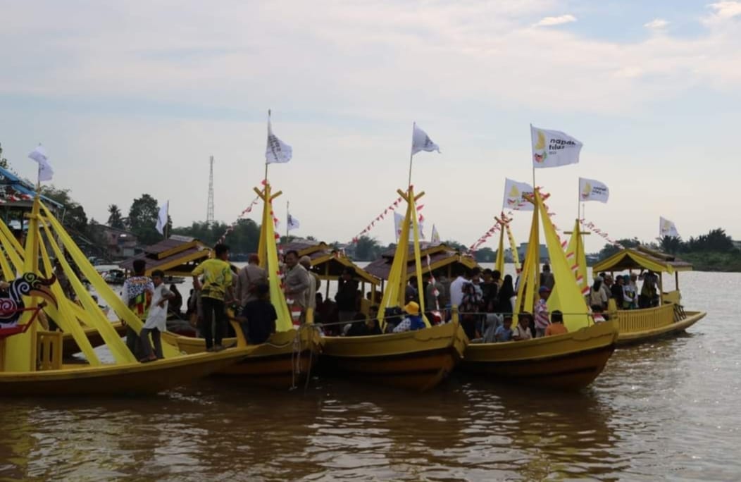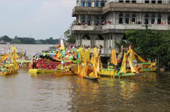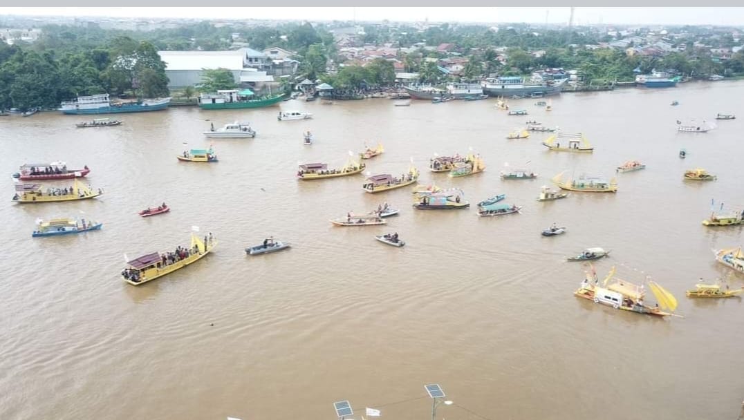 Puluhan perahu hias berlayar di Sungai Pawan, area Keraton Matan Tanjungpura, Kelurahan Mulia Kerta, Kecamatan Benua Kayong Kabupaten Ketapang, pada Jumat (27/10/2023).
