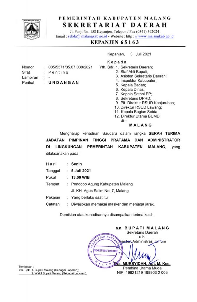 ” Merujuk pada surat Edaran Undangan Resmi dari ” Asisten , Dra. Mursyidah. Apt. M. kes , yang sudah beredar luas dimasyarakat ” kami pihak media akan melakukan Konfirmasi kepada Pihak Humas Kabupaten Malang , dengan Surat edaran Resmi yang bertulisan “Mengharapkan kehadiran saudara dalam rangka Serah Terima Jabatan Pimpinan Tinggi Pratama dan Administrator dilingkungan Kabupaten Malang ,yang di laksanakan Pada :
