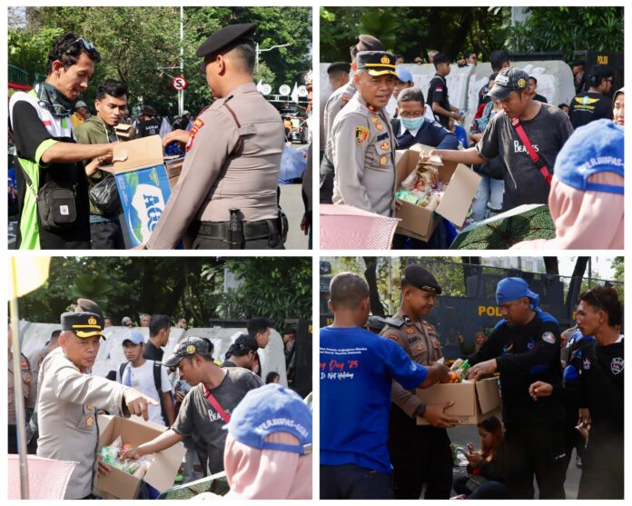 Jakarta Rajawali News – Di tengah teriknya cuaca ibu kota, petugas kepolisian membagikan air mineral dan roti kepada para peserta unjuk rasa yang berkumpul di kawasan Silang Selatan Monas, Gambir, Jakarta Pusat, Rabu (10/9/2025) sore.