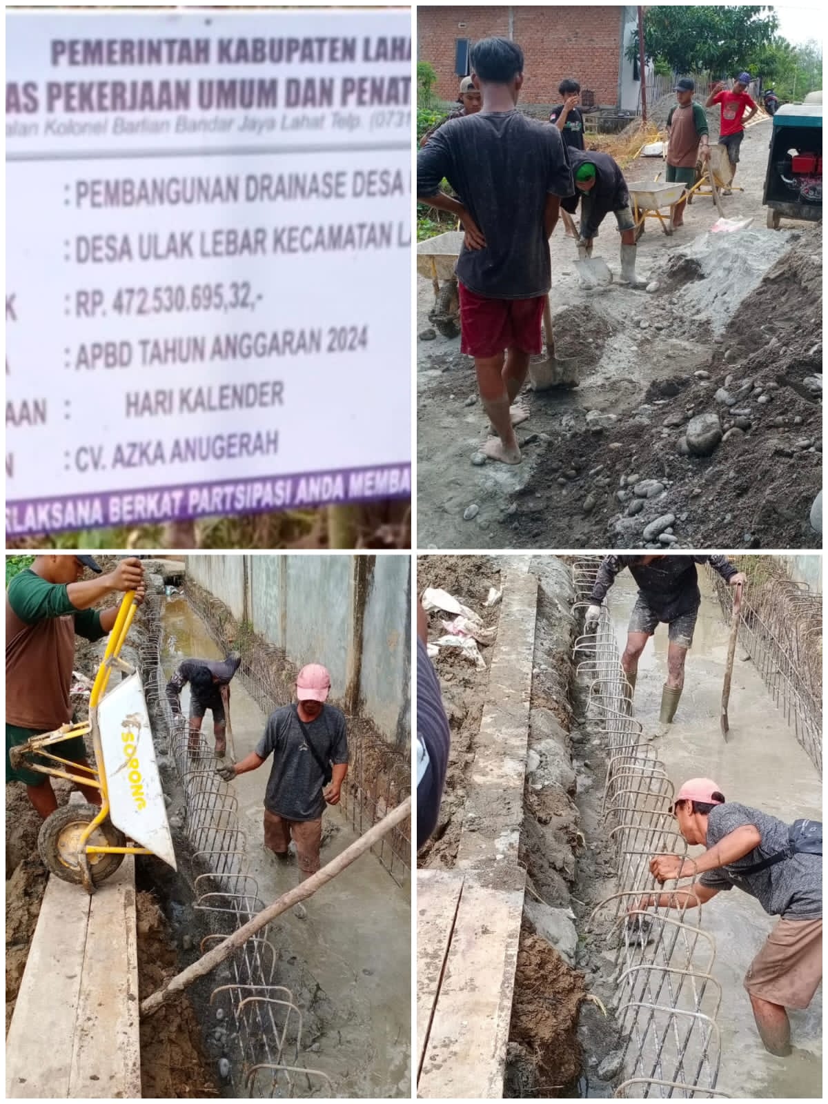 Pembangunan Drainase Desa Ulak Lebar Lahat Nilai Kontrak Rp. 472.530.695,32. Sumber Dana APBD Tahun Anggaran 2024,Pelaksana CV AZKA ANUGERAH