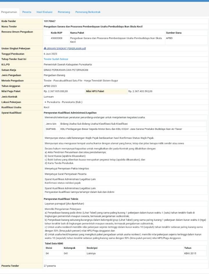 Dalam pantauan awak media yang di tenderkan melalui lembaga pelelangan secara elektronik ( LPSE ) kab,,Purwakarta 6 juni 2023 dengan nilai pagu Rp.2.367.935.000 tahun anggaran : APBD 2023 jenis kontrak : Lumsum