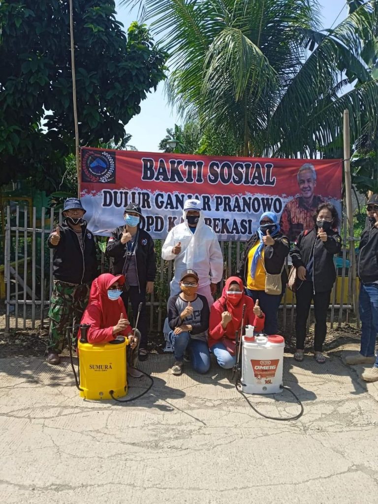 Tidak kenal lelah demi memutus mata rantai penyebaran covid-19 Gerakan Dulur Ganjar Pronowo DPD Bekasi yang di hadiri oleh Wakil Ketua DPG Frans Legowo bersama tim melakukan penyemprotan disinfektan 2 Villa Bekasi Indah Sumber Jaya Senin, 26/07/2021