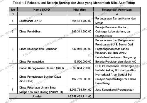 Relawan Rakyat Bela Prabowo mengutip adanya kejanggalan dalam penggunaan Keuwangan APBD Yang di duga keras di buat Bancakan oleh gerombolan pejabat bangsat pasalnya Kegiatan yang menambah nilai Aset Tetap Pada tujuh SKPD sebesar Rp10.257.451.711,00 dianggarkan pada Belanja Barang dan Jasa.