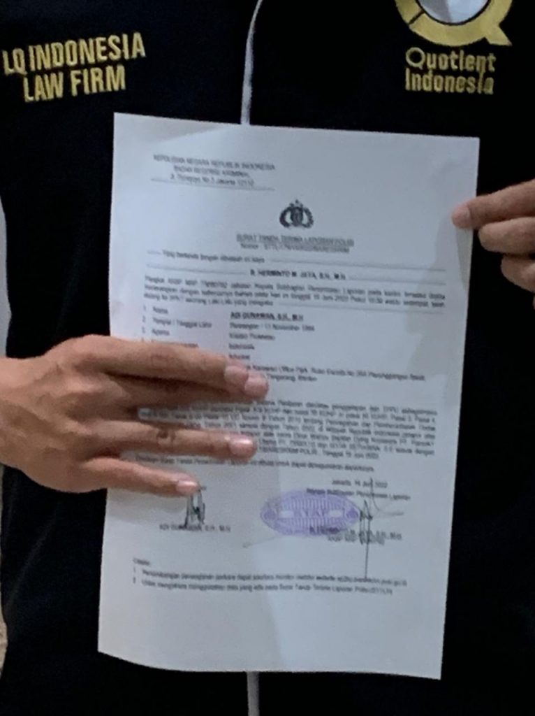 Terkait laporan ini, LQ INDONESIA LAWFIRM berharap Kepolisian cepat memprosesnya, “Kami harap Mabes Polri dapat melakukan penyelidikan dan penyidikan dengan cepat, sehingga terlapor dapat cepat ditangkap”, tutup Advokat Adi Gunawan, S.H., M.H.