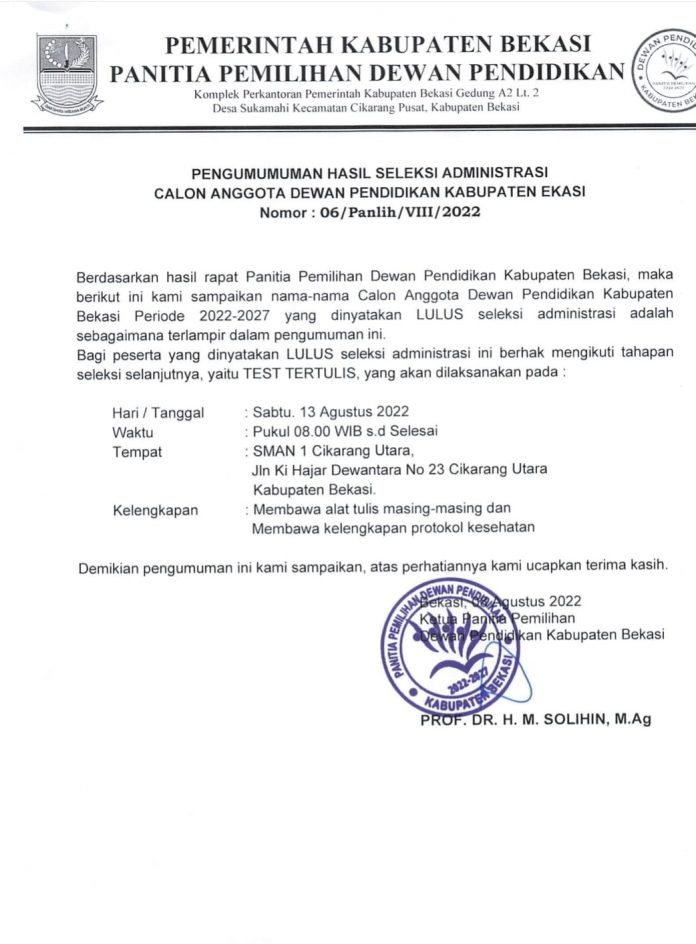 78 orang dinyatakan lulus dalam tahap seleksi administrasi untuk bersaing duduk menjadi Dewan Pendidikan di Kabupaten Bekasi, berdasarkan Surat Pengumuman Hasil Seleksi Calon Anggota Dewan Pendidikan Kabupaten Bekasi, Nomor : 06/Panlih/VIII/2022.