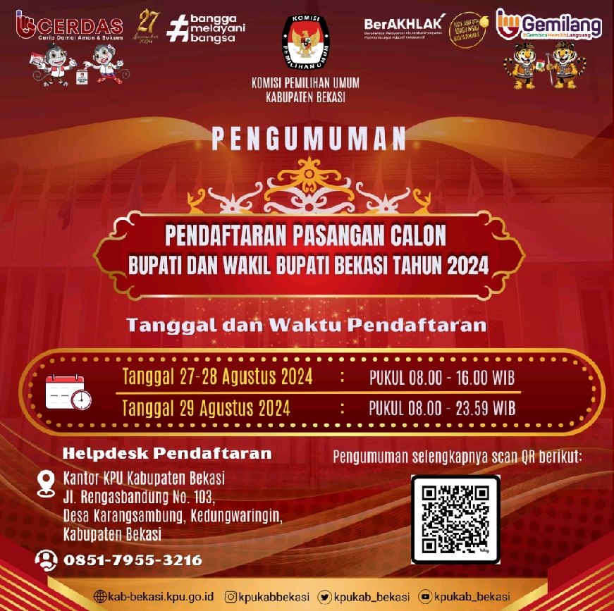 Komisi Pemilihan Umum (KPU) Kabupaten Bekasi secara resmi membuka pendaftaran untuk Pasangan Calon (Paslon) Bupati dan Wakil Bupati Bekasi pada Pilkada Kabupaten Bekasi tahun 2024.