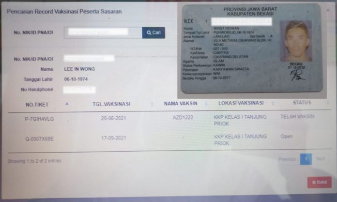 Menurut Wasit Ridwan (47) yang diketahui bekerja di salah satu perusahaan di Cikarang mengatakan, dirinya pada saat itu hendak mengikuti kegiatan vaksinasi di wilayahnya namun dia (Wasit) tidak bisa melakukan vaksinasi dikarenakan saat petugas melakukan input data, Nik e-KTP miliknya sudah digunakan Warga Negara Asing (WNA) bernama Lee In Wong.