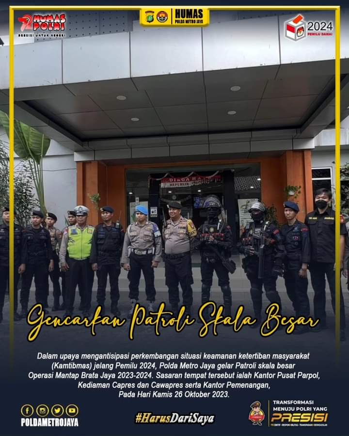 Dalam upaya mengantisipasi perkembangan situasi keamanan ketertiban masyarakat (Kamtibmas) jelang Pemilu 2024, Polda Metro Jaya gelar Patroli skala besar Operasi Mantap Brata Jaya 2023-2024.