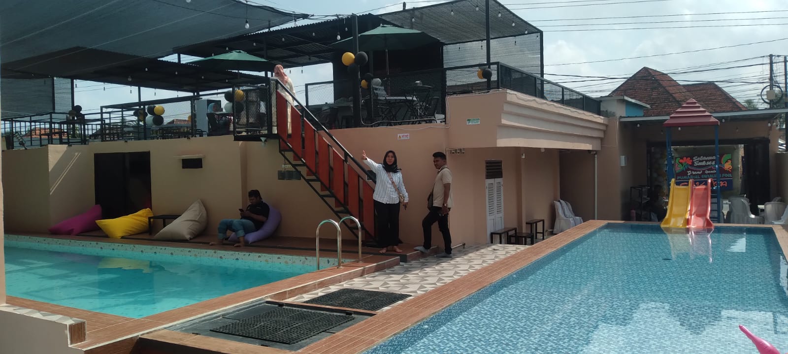 “Disini ada dua kolam renang diameter anak-anak 40 cm – 80 cm, kalau dewasa 120 cm – 160 cm. Nama Pumarial Swimming Pool dan Cafe ini sendiri di ambil dari nama anak “Pumarial” (Putri, Mario, Rizki, Al) biar adil masuk semua namanya, ” Pungkasnya.