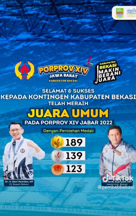 Pelaksanaan pekan olahraga provinsi ke XIV jawa barat tahun 2022 yang mulai di helat pada awal bulan November ini memasuki babak akhir. Event olahraga empat tahunan tingkat provinsi yang mempertandingkan sekira 56 cabang olahraga, 78 disiplin cabang olahraga, dan 1044 nomor pertandingan. Memperebutkan total 8.617 keping medali antaranya 2.626 medali emas, 2.626 medali perak, dan 3.364 medali perunggu ini berhasil di duduki kontingen kabupaten bekasi sebagai daerah yang berpotensi besar menjadi juara umum Porprov ke – XIV Jabar 2022 dengan raihan medali terkini sebanyak 189 emas, 139 perak, dan 123 perunggu.