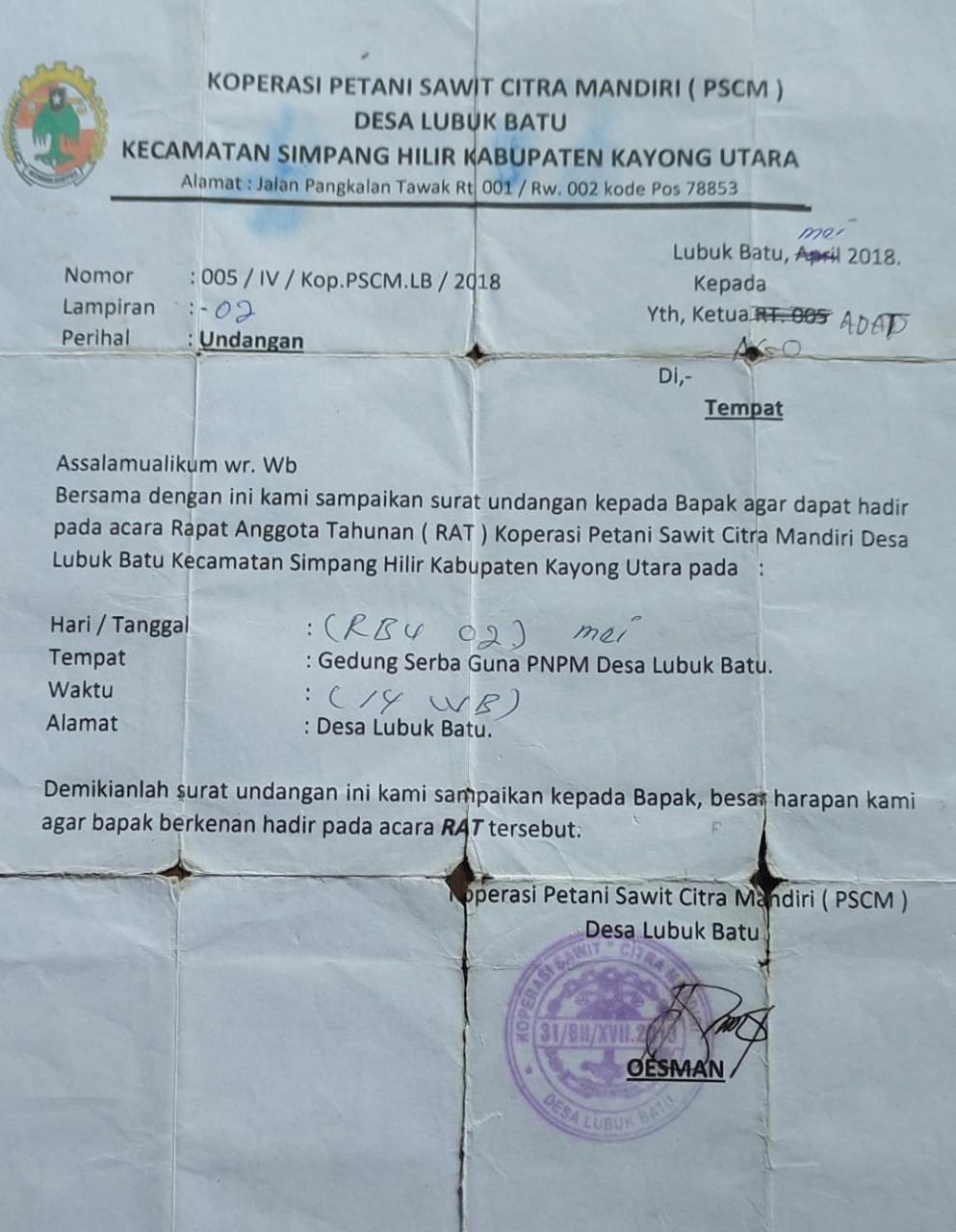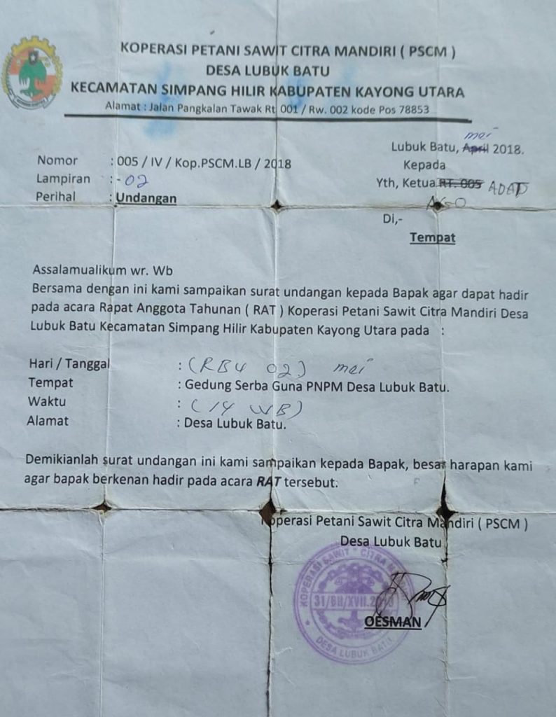 Data yang baru diterbitkan dan dibuat oleh Ketua Koperasi sebut namanya Oesman bersama kuasanya Kades (Kelapa Desa) Lubuk Batu sebut namanya Ibnu yang mana terindikasi disinyalir kuat adanya fakta memanipulasi data drap daftar nama anggota Koperasi PSCM. Desa Lubuk Batu Kecamatan Simpang Hilir Kabupaten Kayong Utara (KKU) wilayah hukum Kalimantan Barat (Kalbar)