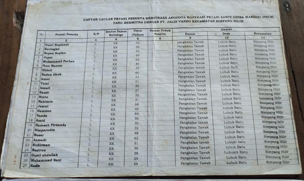 Di dalam Dokumen Daftar Anggota Koperasi yang sudah berbadan hukum jelas dalam data lama itu banyak nama-nama seperti Sumardi, Rupiana, Jakar, Sekinun, Nawik, Marisa, Miro, Saidi di hilangkan termasuk data baru tidak jelas sudah di rombak sebanyak 3 (Tiga) kali. Dirobah Ketua Koperasi PSCM Oesman beserta Kades Ibnu. Data awal Daftar Calon Petani Tetap (CPT) di Koperasi PSCM.