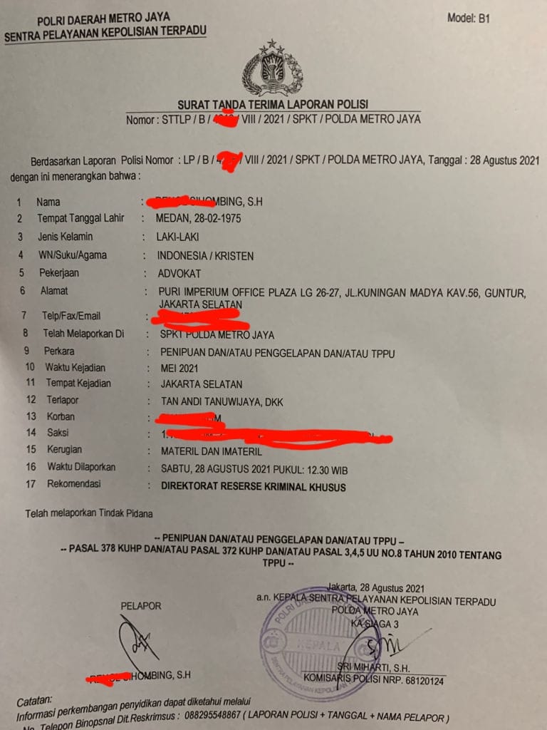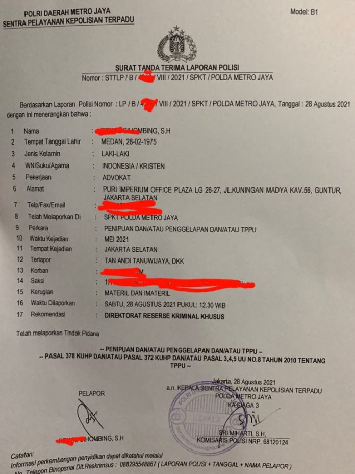 Tan Andi Tanuwijaya, dkk di laporkan polisi oleh pengacara Renol Sihombing, SH dengan LP No 4216/ VIII/ 2021/SPKT/ Polda Metro Jaya Tanggal 28 Agustus 2021 sebagai kuasa hukum dari pengusaha BS sebagai Korban.