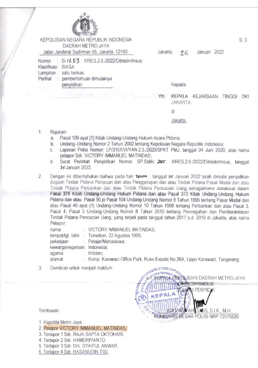 “Setelah sebelumnya LP Mahkota dengan Terlapor Raja Sapta Oktohari di naikkan ke penyidikan dengan SPDP No B/724/I/RES 2.6/2022/Ditreskrimsus tanggal 17 Januari 2022. Kali ini giliran Kasus Dugaan penipuan, penggelapan, pidana pasar modal dan pencucian uang yang diduga dilakukan oleh Raja Sapta Oktohari dan Hasanudin Tisi, dkk melalui PT OSO Sekuritas dinaikkan ke status penyidikan dengan terbitnya SPDP (Surat perintah dimulai penyidikan) No B/1253/I/RES 2.6/2022/Ditreskrimsus tanggal 26 Januari 2022, ternag Alvin Lim.