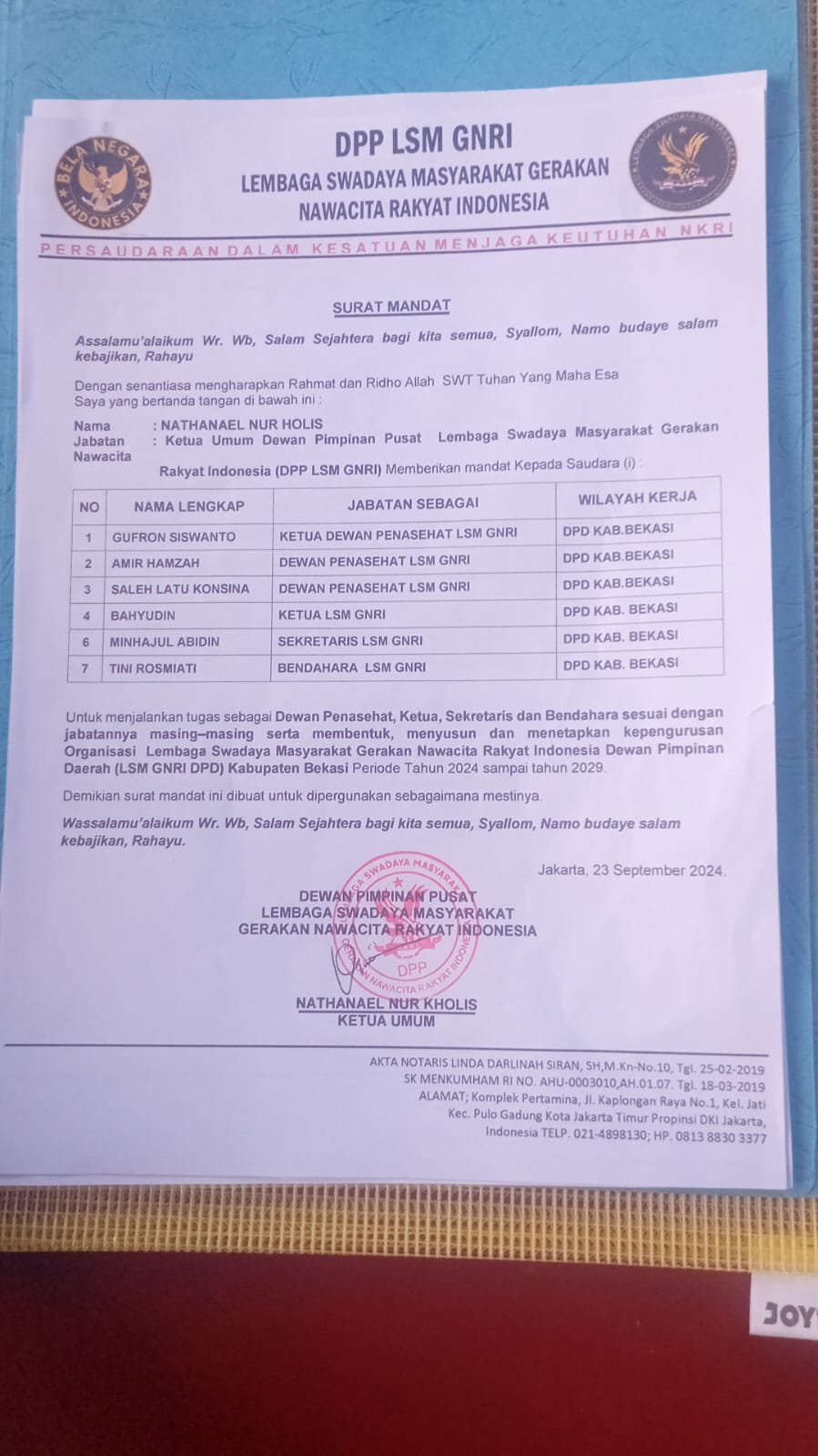 Dalam gelaran acara Dewan Pimpinan Darrah Gerakan Nawacita Rakyat Indonesia (DPD GNRI) yang dibuka langsung Ketua DPD Bekasi Bahyudin berjalan lancar, dimana acara tersebut lebih fokus pada pemaparan program disertai pembentukan team Pelaksana. Dengan tujuan agar di tahun 2025 nanti LSM GNRI dapat melaksanakan program yang ada Jumat,(28/9/2024).