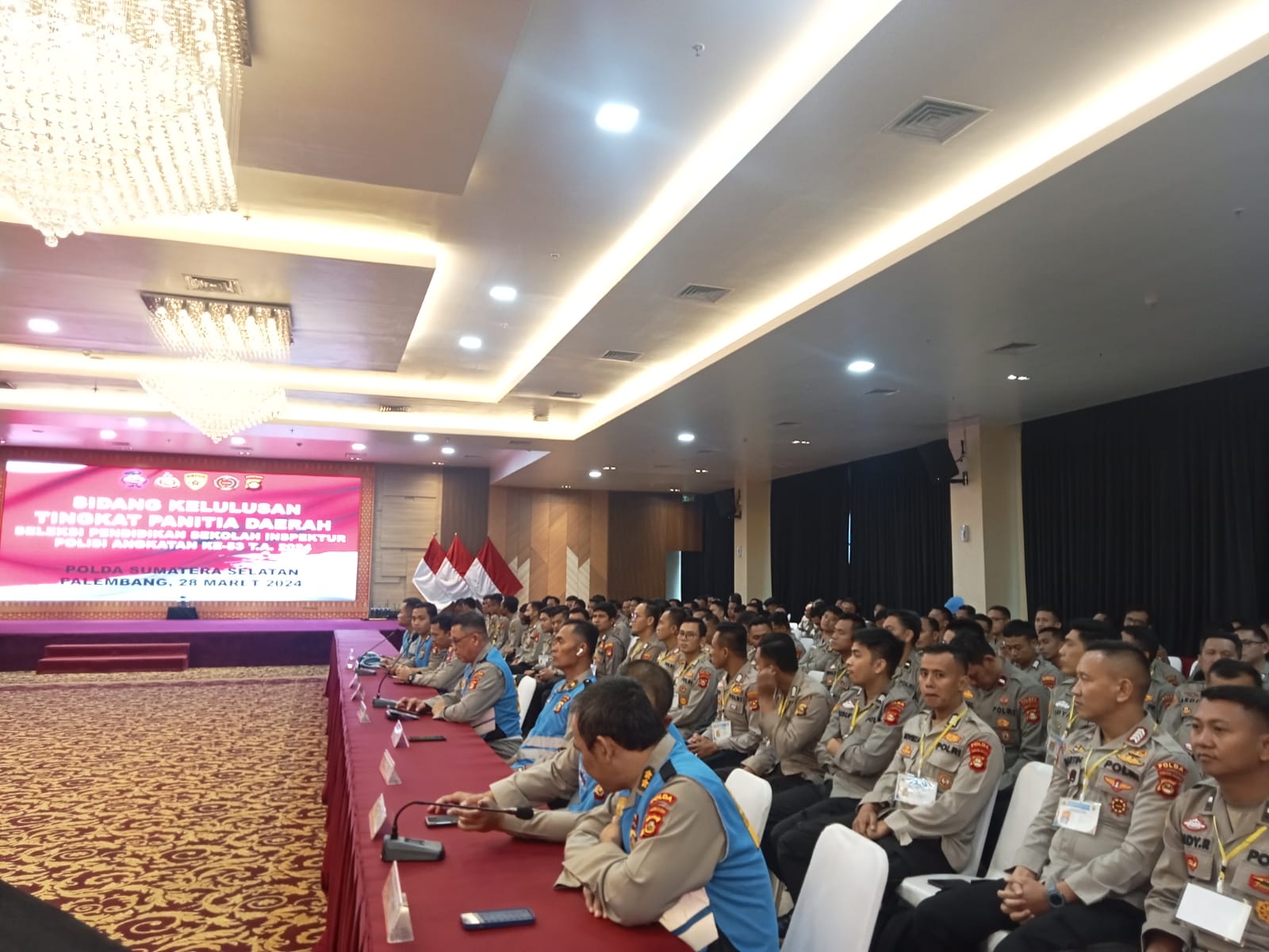Luar Biasa Sebanyak 111 Bintara Polda Sumsel dinyatakan lulus terpilih calon perwira dan ikut Sekolah Inspektur polisi (SIP) Tahun 2024 di Sukabumi Jawa Barat. Kelulusan itu diumumkan pada sidang kelulusan seleksi penerimaan SIP Polda Sumsel yang dipimpin Kepala Biro (Karo) Sumber Daya Manusia (SDM), Kombes Pol Sudrajad Hariwibowo SIK,MSI didampingi Kabag Dalpers Ro SDM Polda Sumsel AKBP Zainal Arrachman SiK, di Auditorium lantai VII gedung Utama Presisi Polda Sumsel, Kamis (28/3/2024) Sore