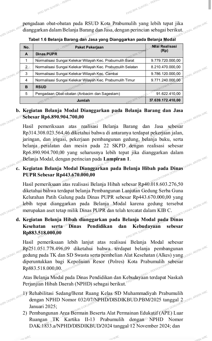 Hasil pemeriksaan lebih lanjut atas realisasi Belanja Modal sebesar Rp251.051.778.496,09 diketahui bahwa di antaranya terdapat belanja modal pekerjaan normalisasi sungai Kelekar pada Dinas PUPR dan belanja modakpengadaan obat-obatan pada RSUD Kota Prabumulih yang lebih tepat jika dianggarkan dalam Belanja Barang dan Jasa, dengan perincian sebagai berikut.