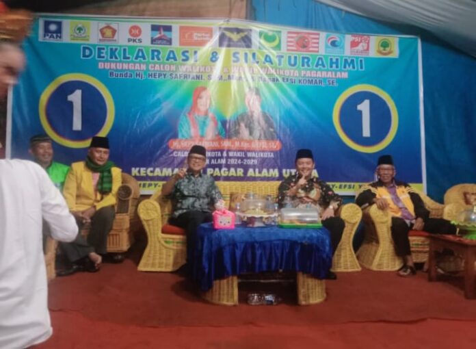 PAGARALAM,- Rajawalinews,- Pasangan Calon Walikota dan Wakil Walikota Pagaralam 2024-2029 Hj Hepy Safriani SKM.M.Kes dan Efsi Komar.SE kembali melakukan Silaturahmi dan deklarasi Ke Masyarakat dalam rangkaian kegiatan kampanye Paslon 01 di Dusun Tanjung Aro, Kelurahan Kuripan Babas Kecamatan Pagaralam Utara Kota Pagaralam Senin malam (18/11/2024).