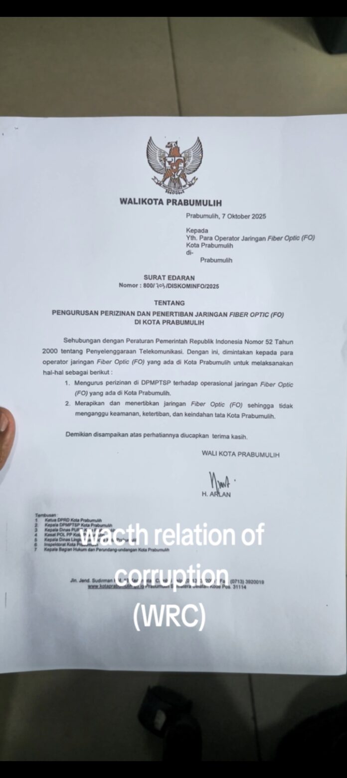 Surat Edaran Wali Kota Prabumulih no 800/703/ Diskominfo/2025, terkait penertiban dan pengurusan perizinan jaringan Fiber Optic (FO) dinilai belum berjalan efektif.