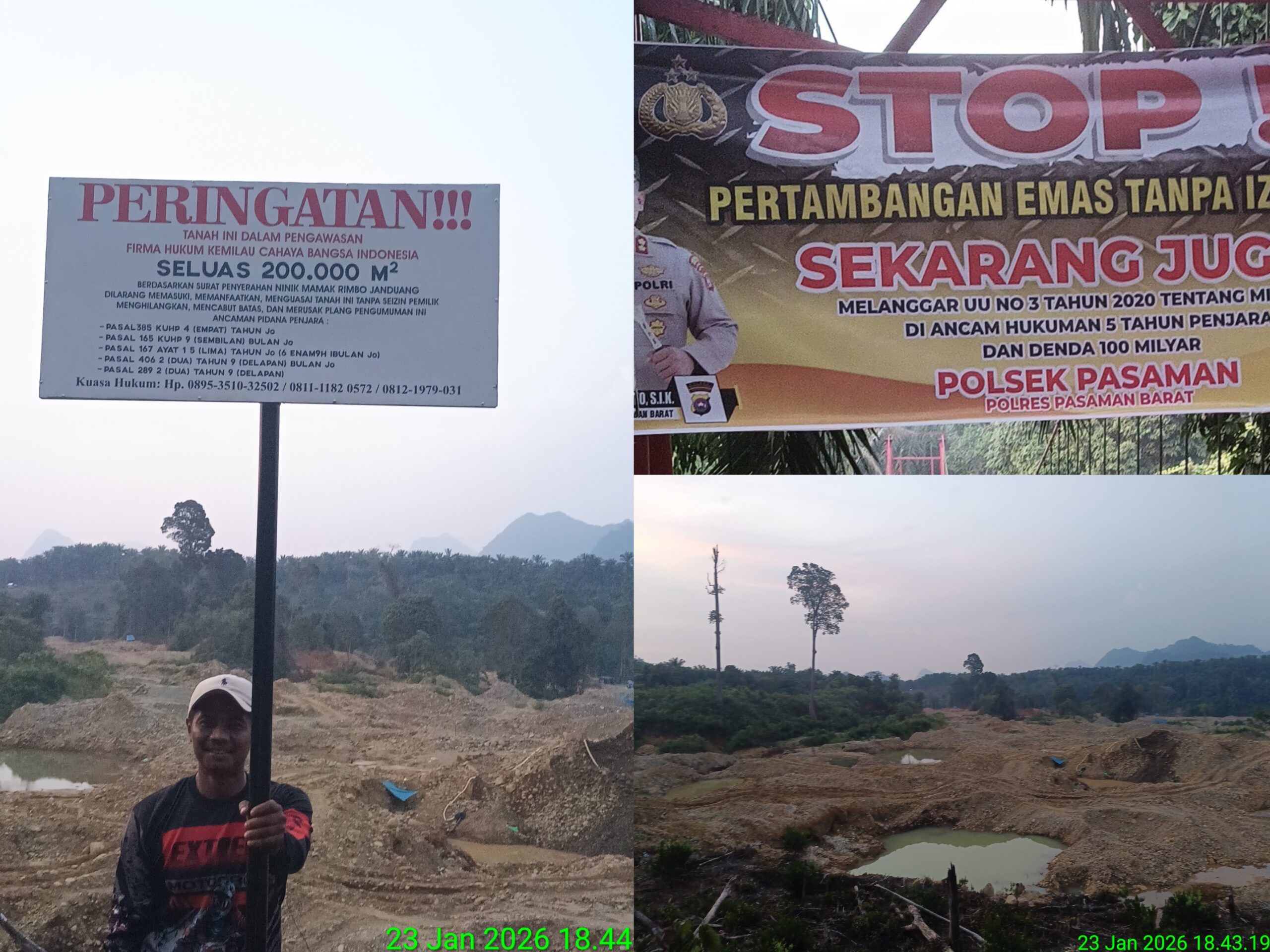 Pasaman Barat — Sebidang lahan seluas kurang lebih 200.000 meter persegi di wilayah Rimbo Janduang dipasangi plang peringatan yang menyatakan bahwa tanah tersebut berada dalam pengawasan Firma Hukum Kemilau Cahaya Bangsa Indonesia. Pemasangan plang tersebut dilakukan sebagai bentuk pemberitahuan kepada publik terkait klaim kepemilikan atas lahan dimaksud.