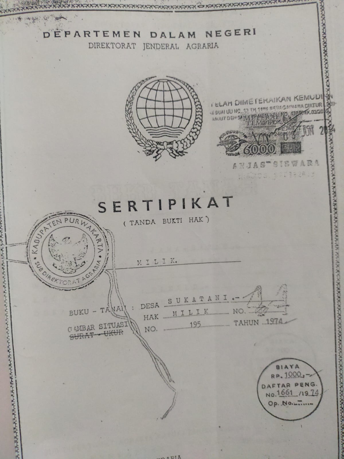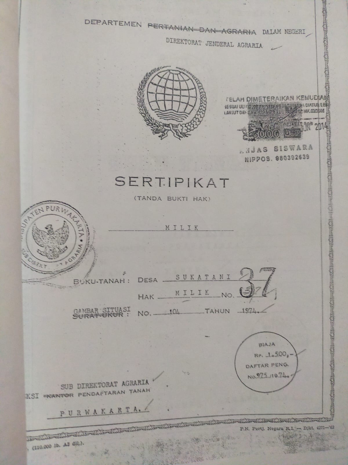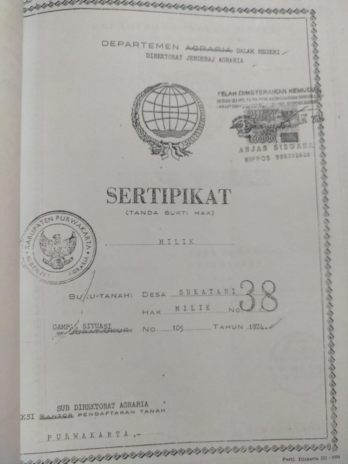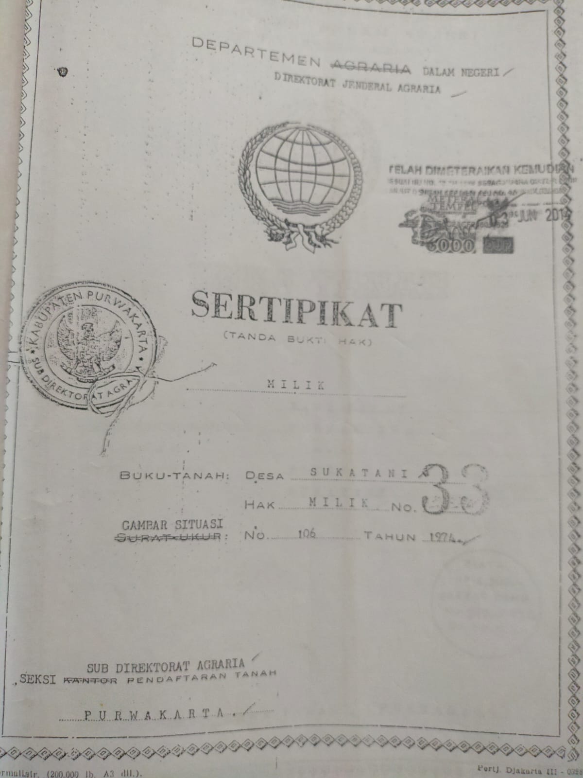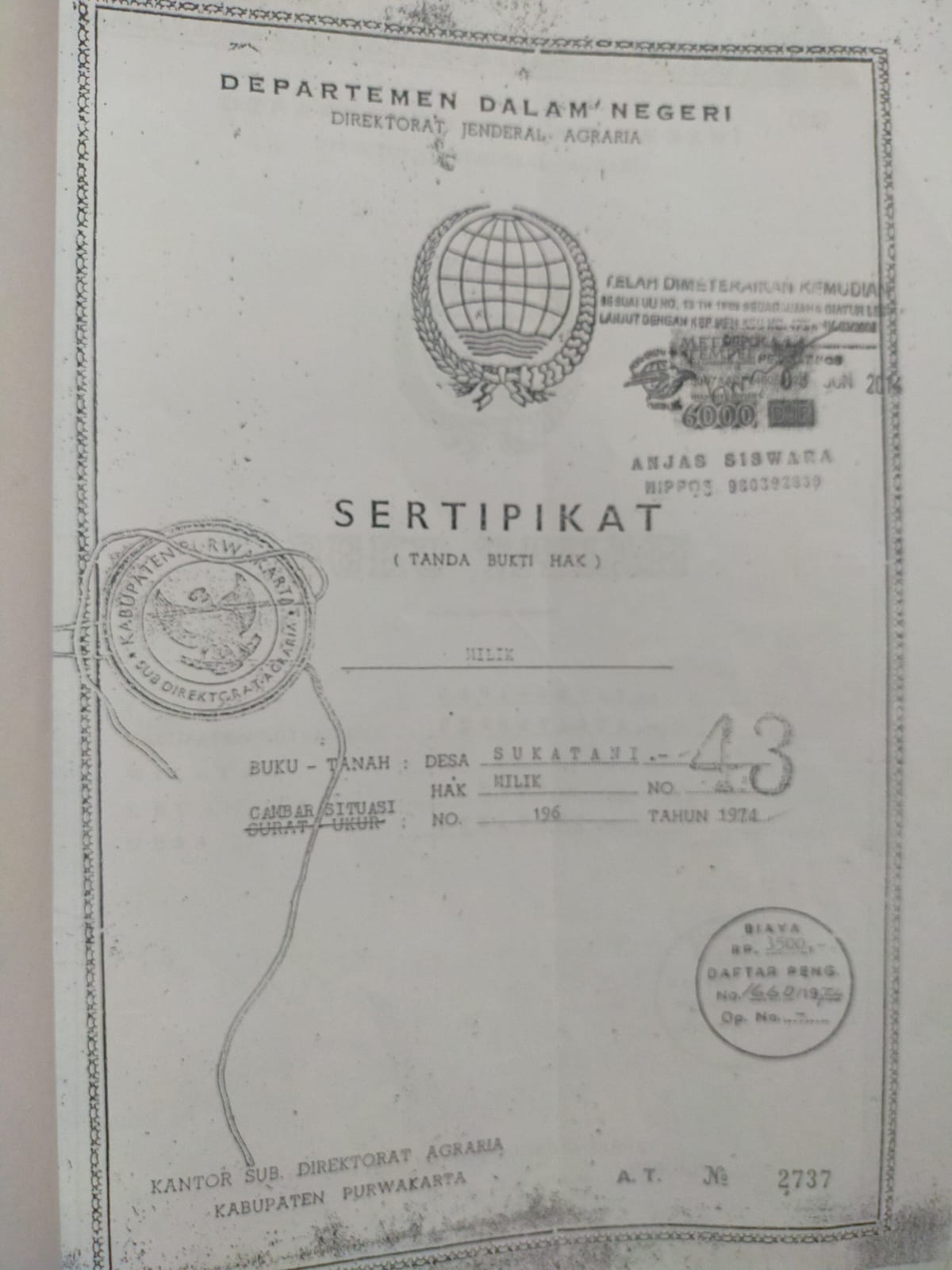 Sertipikat nomor 43 nama pemegang hak milik FATMA. ZAHRA Komvresi dari kekitir nomor C .2499 / 47 Persil 215 D.V Luwas 74.490 M2 Pendaptaran Purwakarta tanggal 18-9-1974