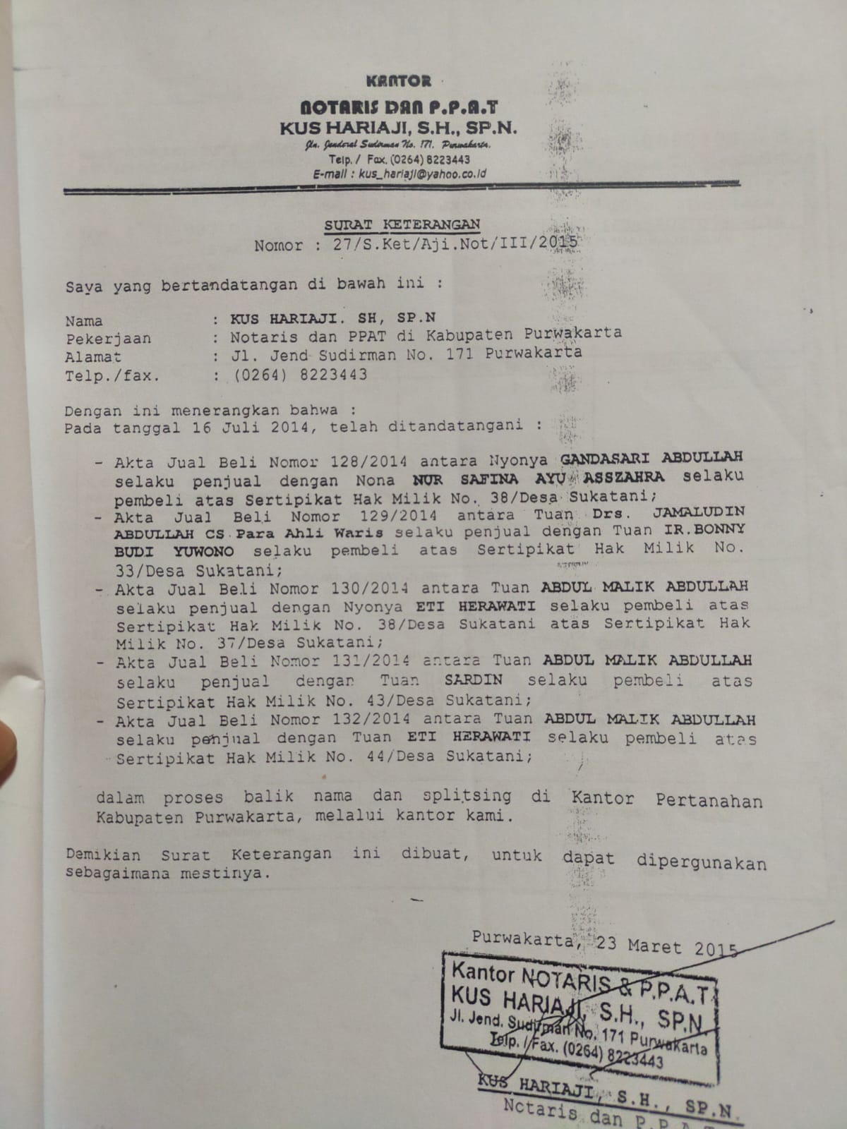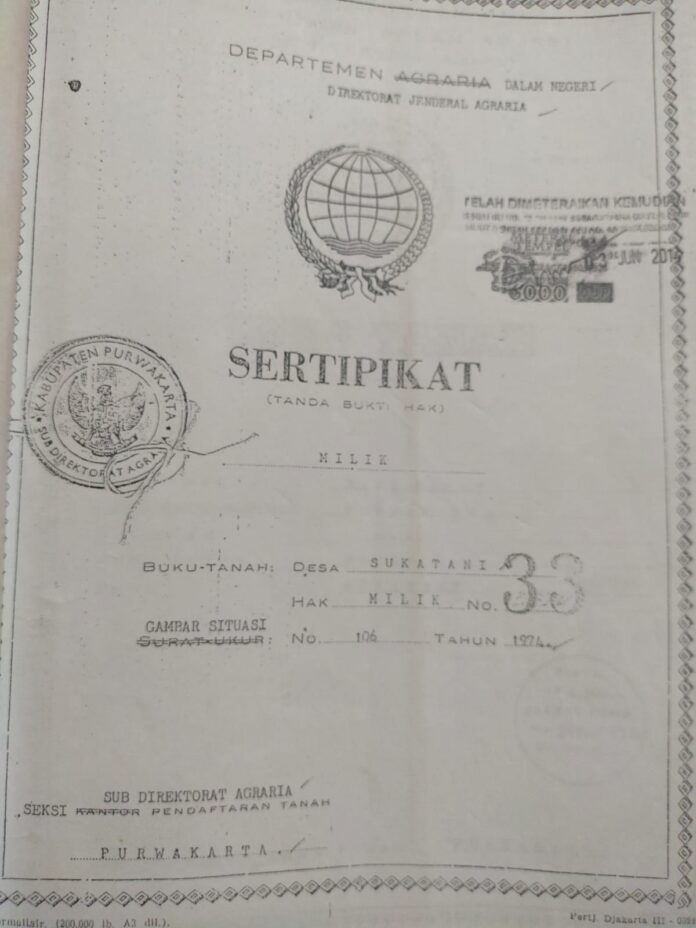 Hal tersebut Sesuai Surat keterangan dari Kantor Desa Sukatani Nomor . 474 / 398 / PEM / VII / 2011, Ironisnya Pihak kantor notaris DAN P.P.A.T KUS HARIANJA S .H.,SP.N yang berkantor di jalan sudirman no.171 Purwakarta Jawa barat menerbitkan surat keterangan No: 27/s.Ket/Aji . not / lll / 2015.