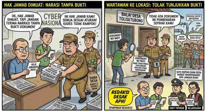 Namun, rilis klarifikasi yang dikirimkan oleh Pemerintah Desa Tolisetubono ke meja redaksi hanya berupa narasi dan klaim angka tanpa didukung oleh dokumen pendukung seperti APBDes, RKPDes, maupun Berita Acara Musyawarah Desa. Atas dasar profesionalisme jurnalistik, Pimpinan Redaksi Cyber Nasional kemudian memerintahkan wartawan lapangan untuk mendatangi kantor desa guna memverifikasi kebenaran narasi tersebut agar berita sanggahan pihak desa memiliki dasar hukum yang kuat.
