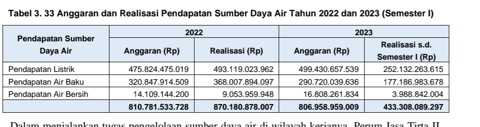 Sedangkan pada tahun 2023, realisasi pendapatan sumber daya air (s.d. Juni 2023) adalah sebesar Rp433.308.089.298,00 atau 53,70% dari anggaran tahun 2023 sebesar Rp806.958.959.009,00, dimana sebesar Rp177.186.983.678,00 merupakan realisasi pendapatan air baku. Rincian pada Tabel berikut.