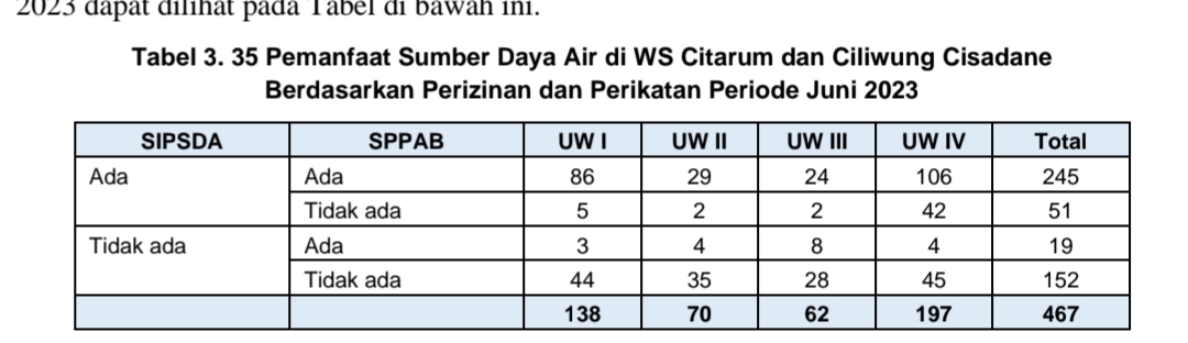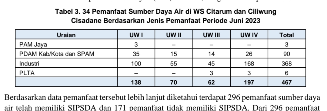 a. Sebanyak 222 pemanfaat Sumber Daya Air belum memiliki SIPSDA dan/atau SPPAB Jumlah pemanfaat sumber daya air per 30 Juni 2023 pada WS Citarum dan Ciliwung Cisadane sebanyak 467 pemanfaat, yang terdiri dari 93 intake PDAM dan SPAM, 368 intake industri,dan enam intake PLTA pada Unit Wilayah (UW) I s.d. IV, dengan rincian pada Tabel berikut.