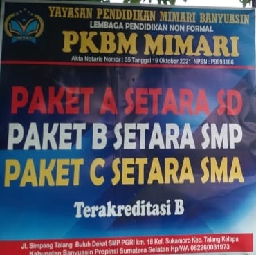 Yayasan pendidikan Mimari Banyuasin sebagai lembaga pendidikan non formal Pusat Kegiatan Belajar Masyarakat (PKBM), per 01 Maret tahun 2024 secara resmi telah membuka penerimaan peserta didik baru untuk Tahun Ajaran 2024-2025.