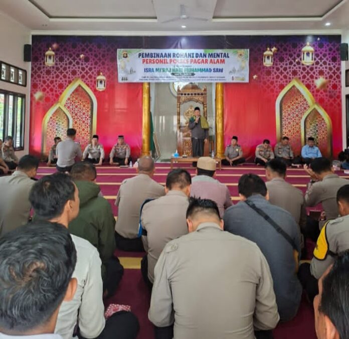 Pagar Alam,- Rajawalunews,- Suasana penuh khidmat menyelimuti Masjid Al-Hikmah Polres Pagar Alam, Kamis (15/01/2026). Dalam rangka peringatan Isra Mi’raj Nabi Muhammad SAW, Polres Pagar Alam menggelar pembinaan rohani dan mental kepribadian yang dipimpin langsung oleh Kapolres AKBP Januar Kencana Setia Persada.SIK, sebagai wujud komitmen membangun personel Polri yang beriman dan berakhlak mulia.